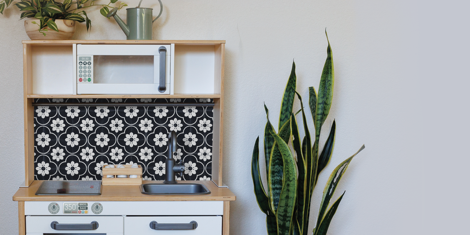 Pink Floral Tile Printed Backsplash Board for Ikea DUKTIG Play Kitchen // Makeover, Diy, Hack, Ikea, Custom